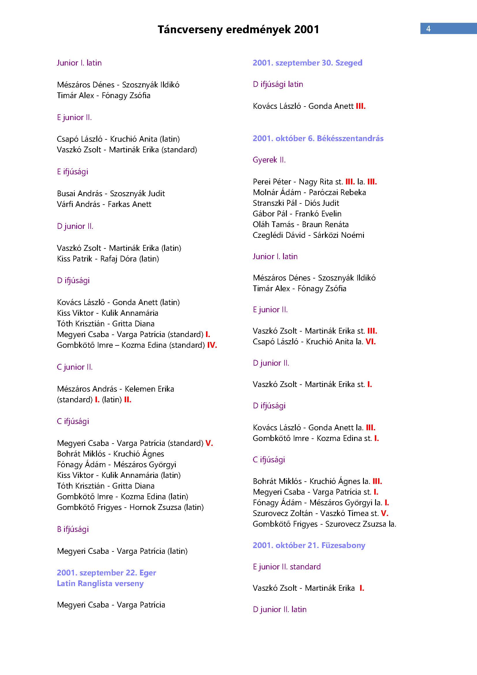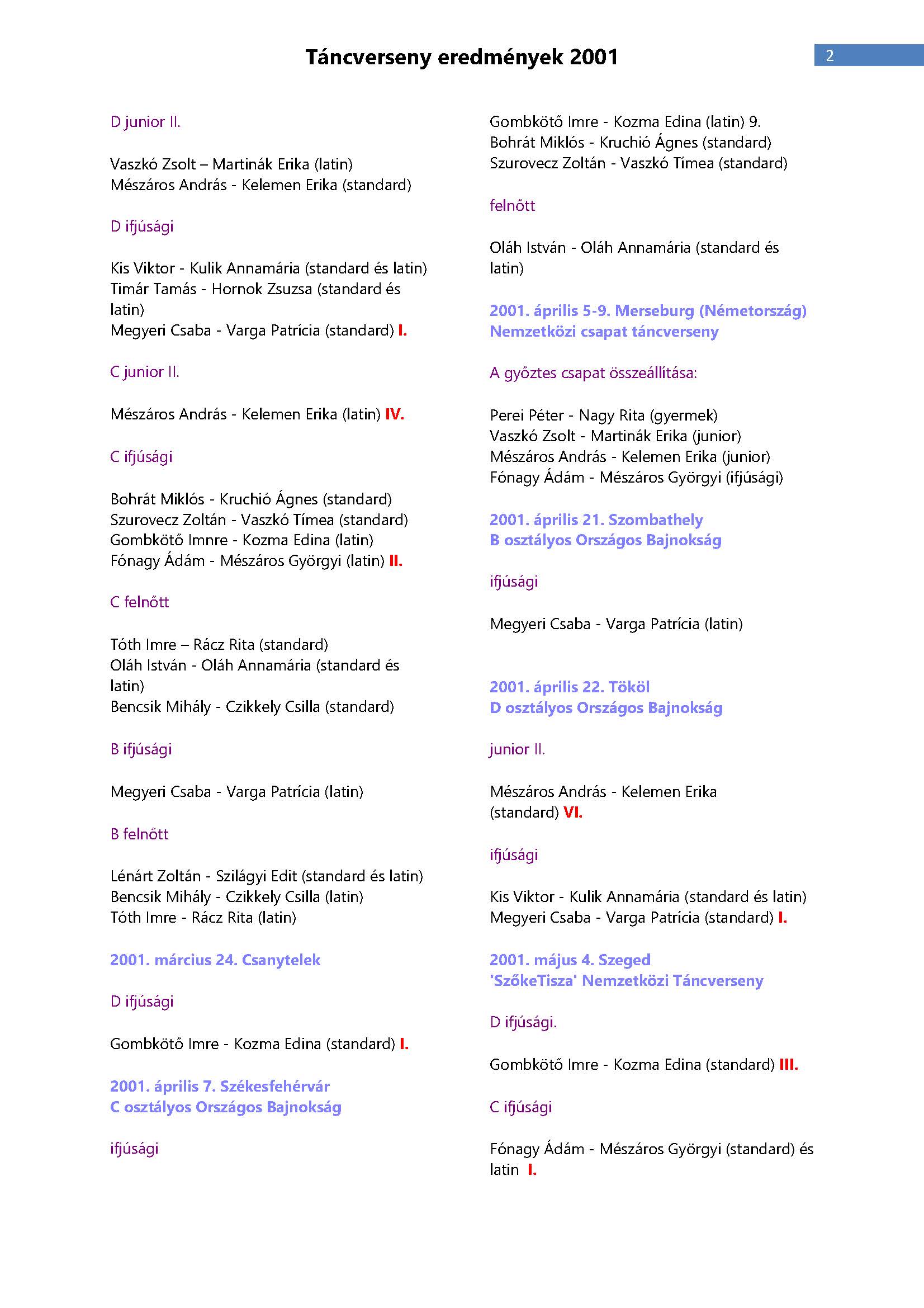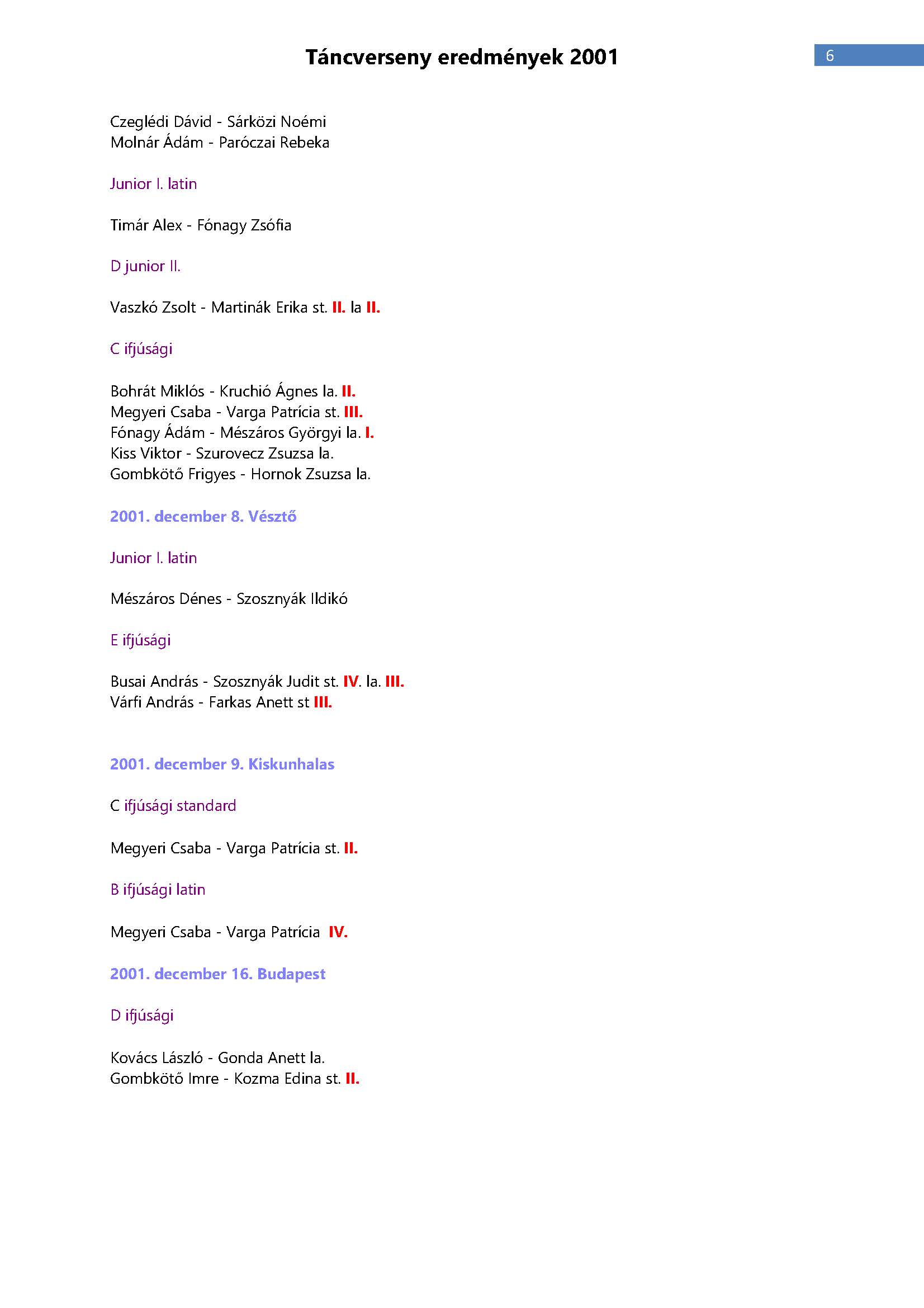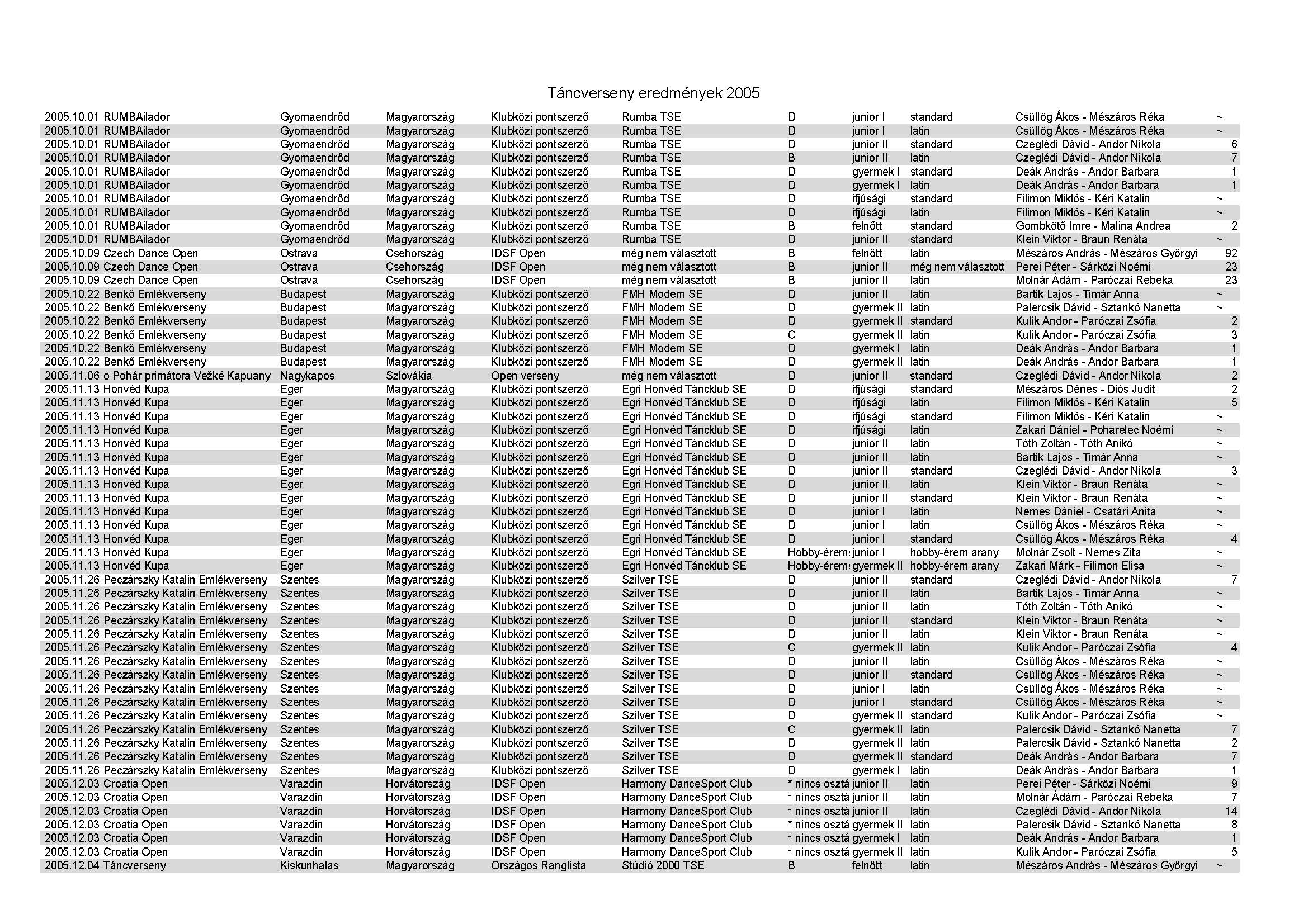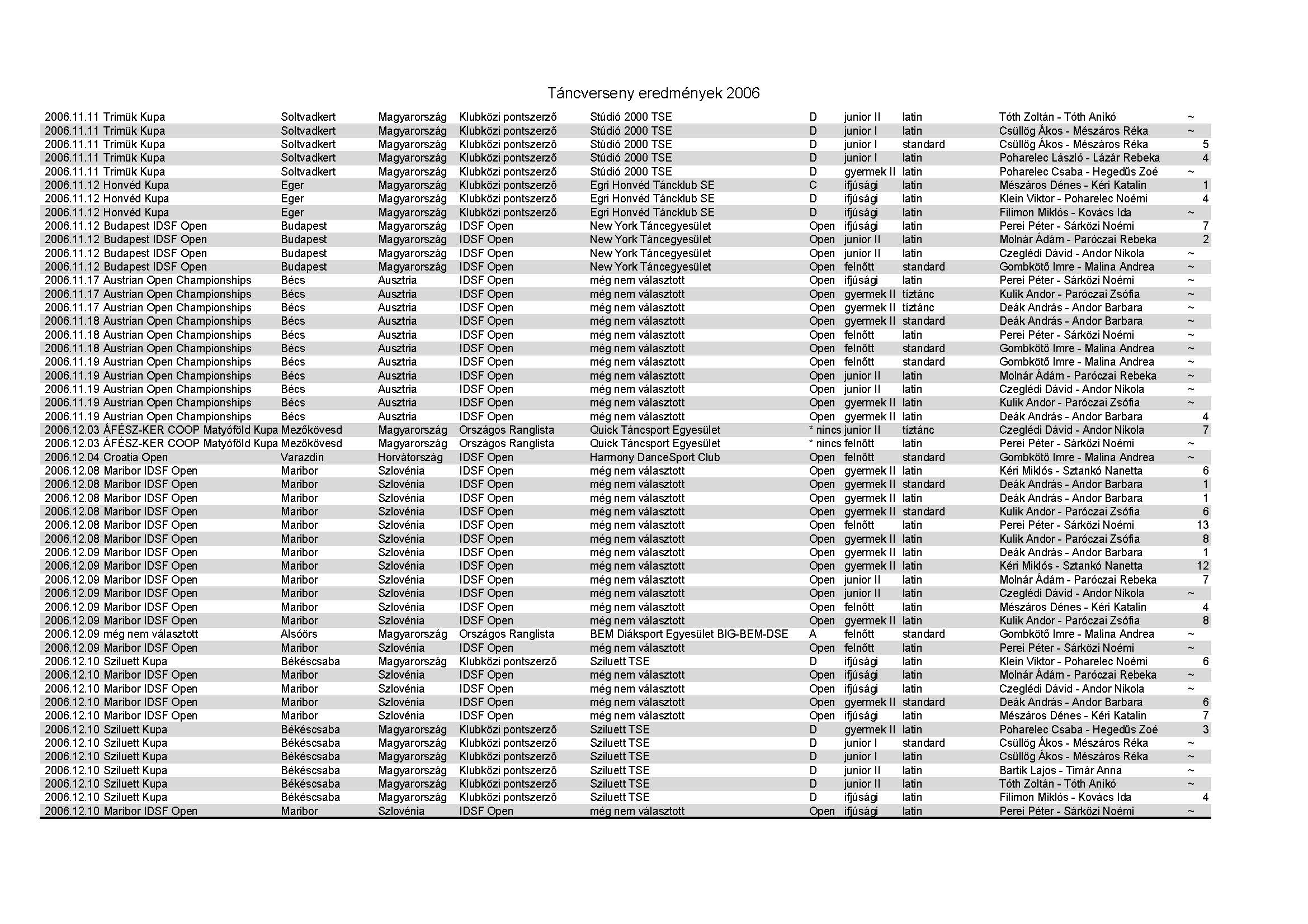Versenyeredmények 1998-2016