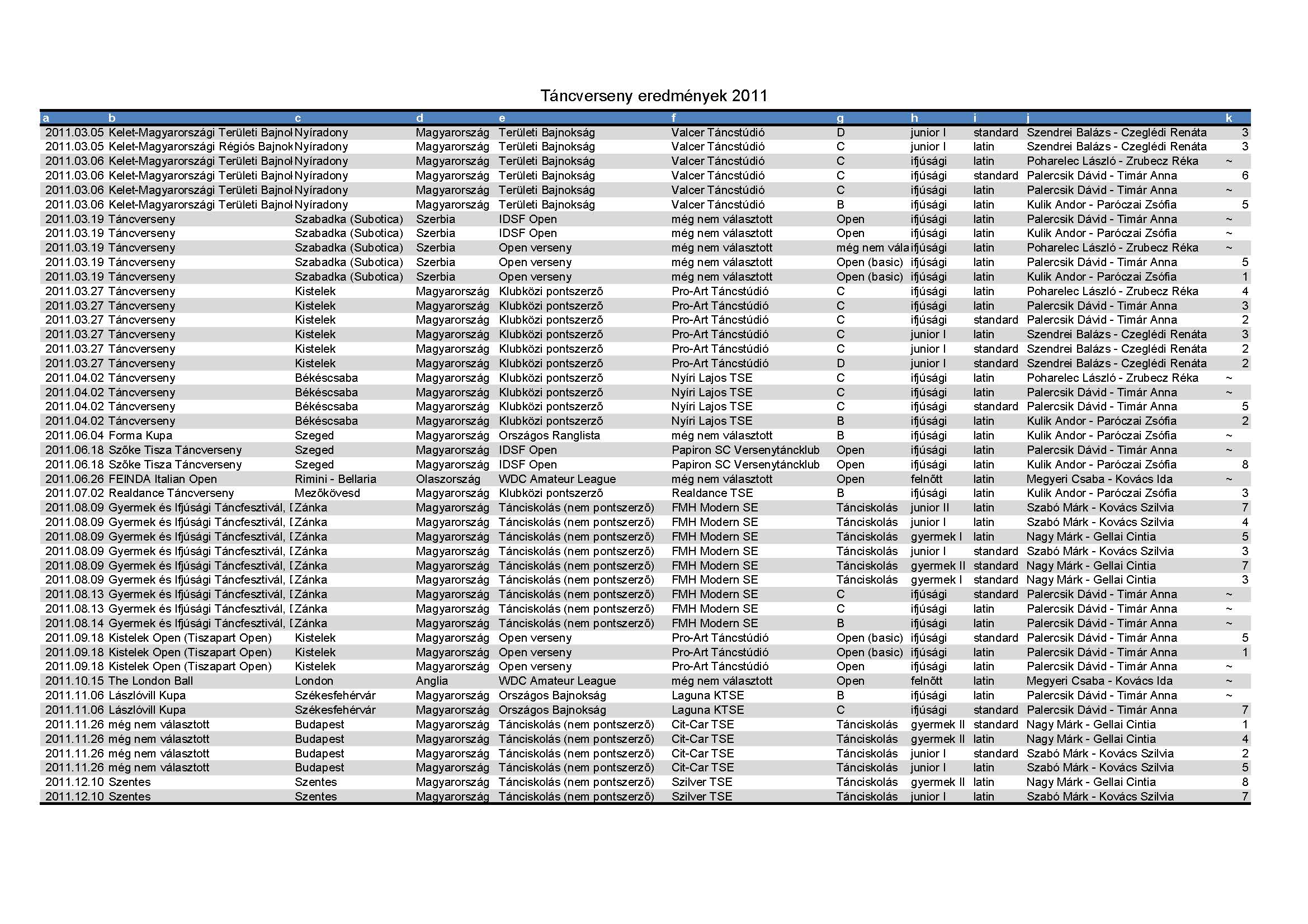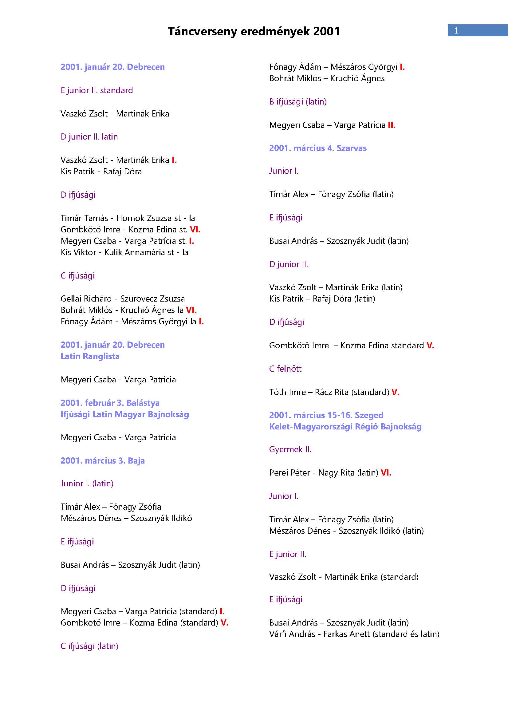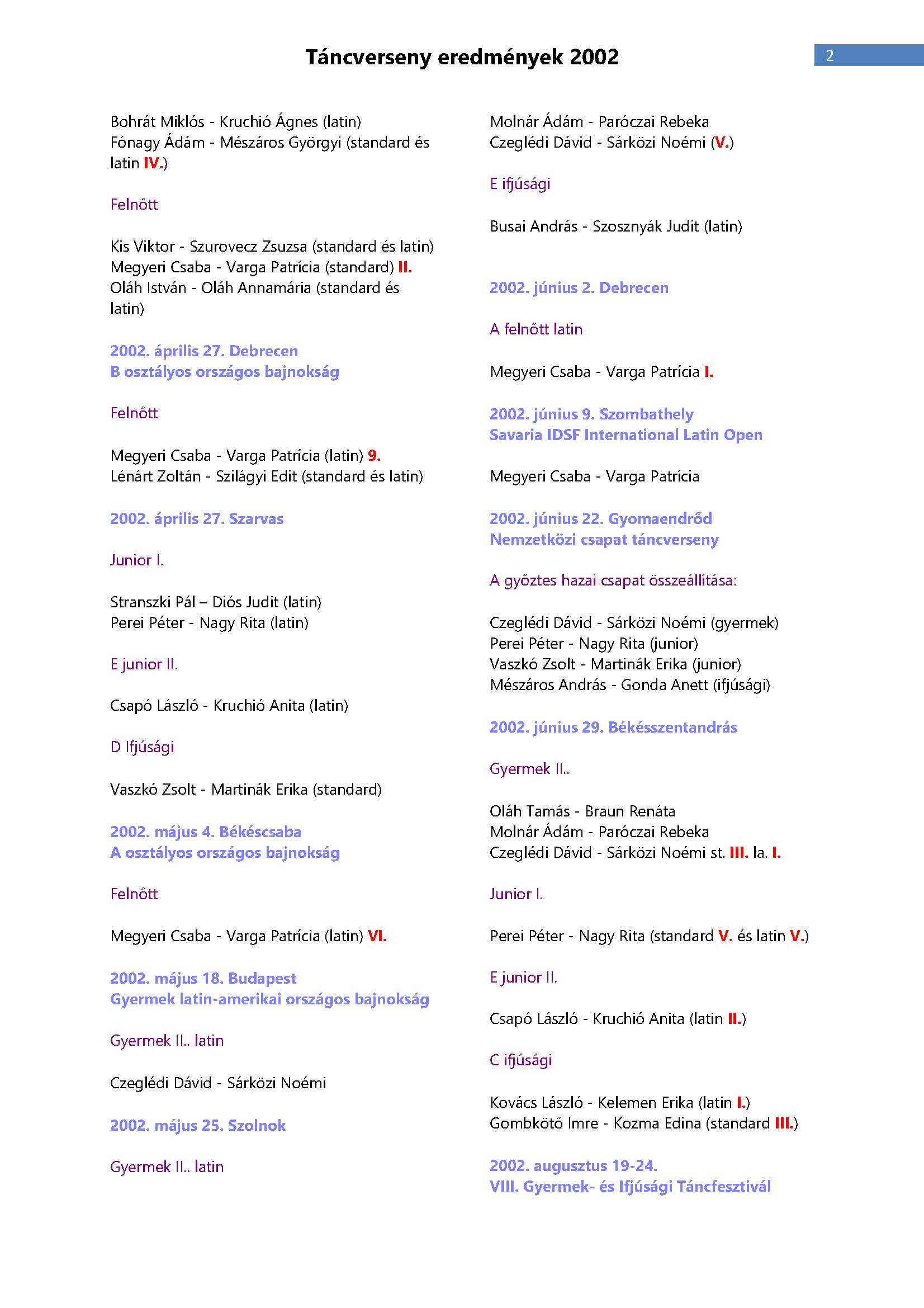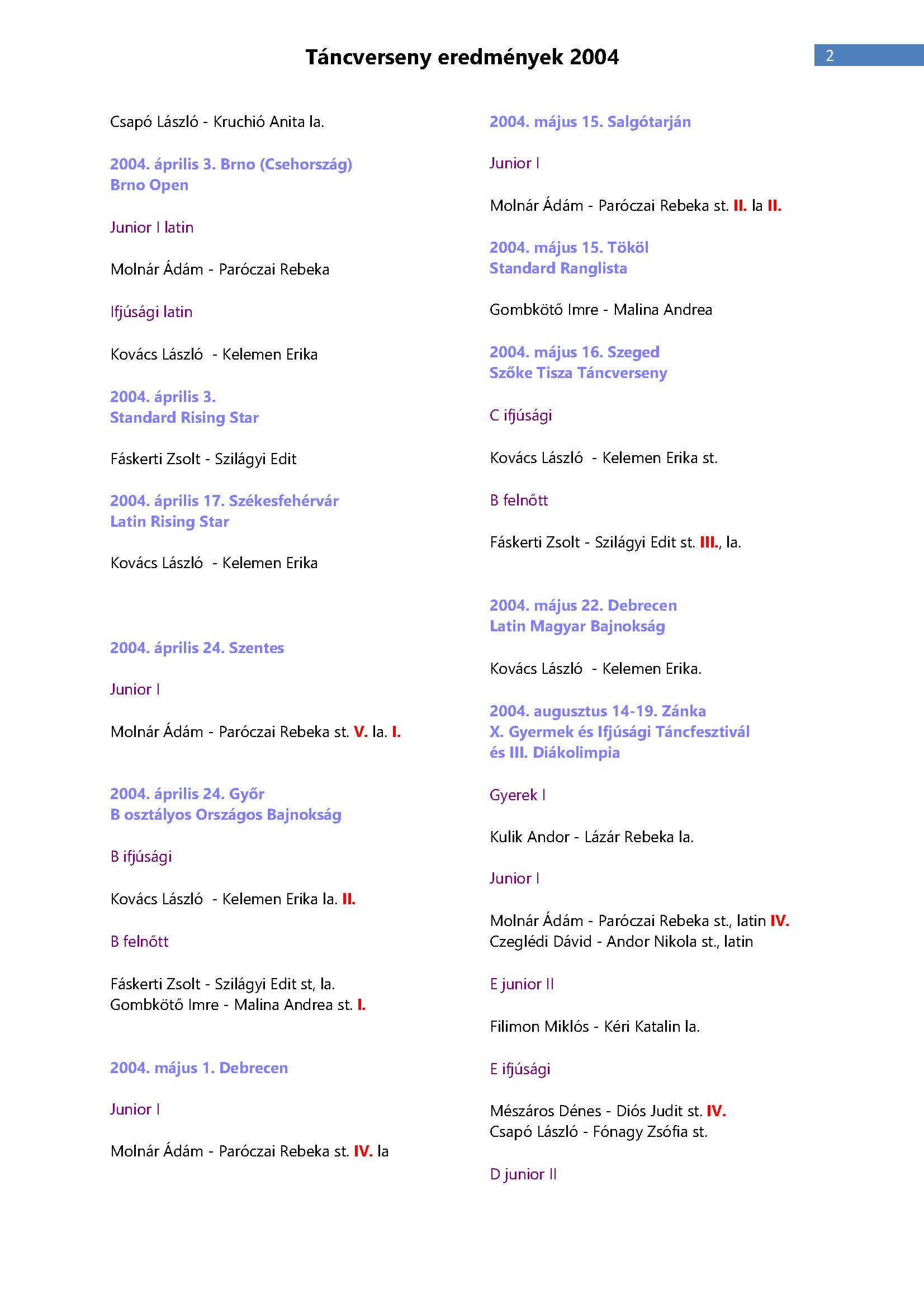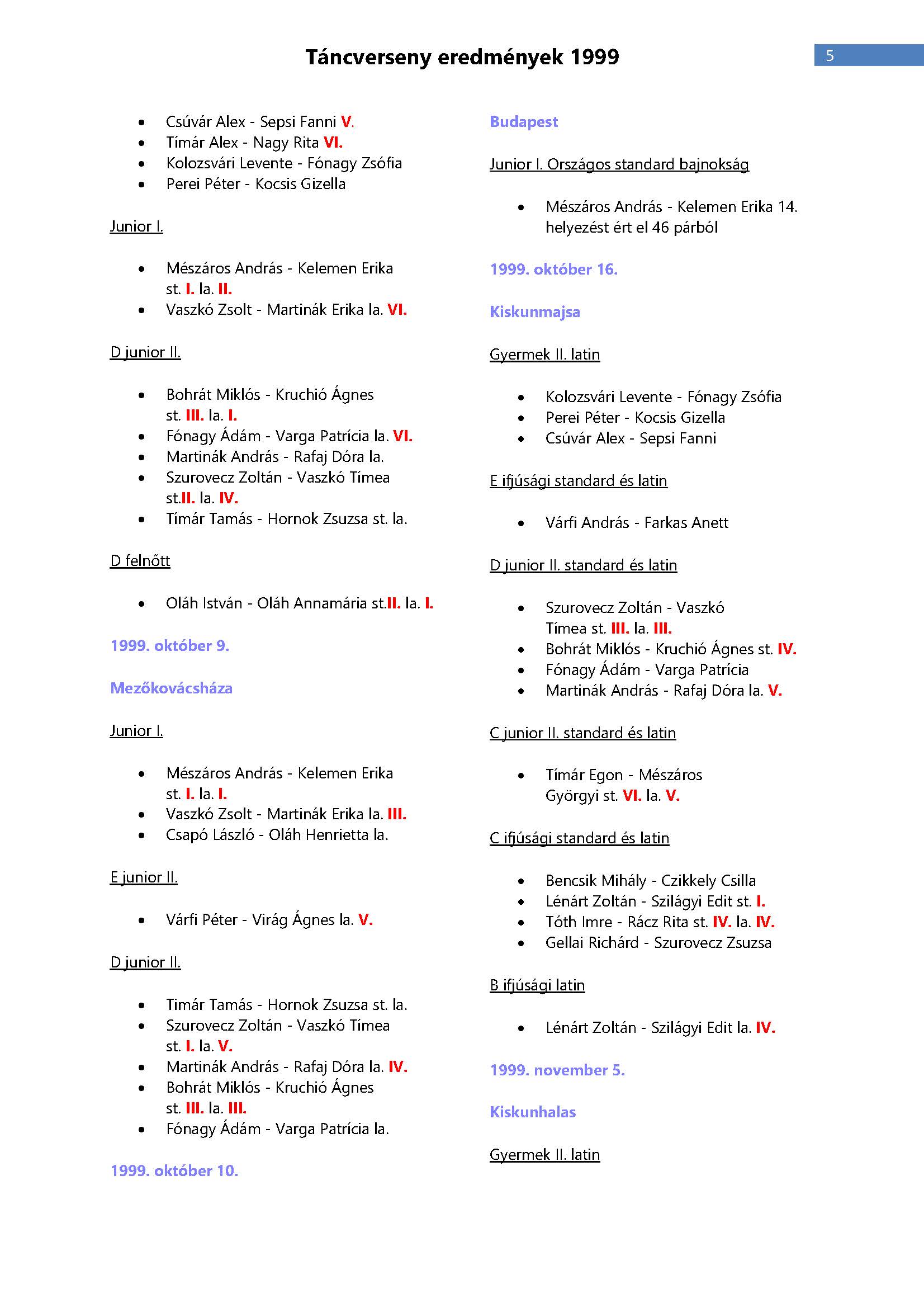 Versenyeredmények 1998-2016