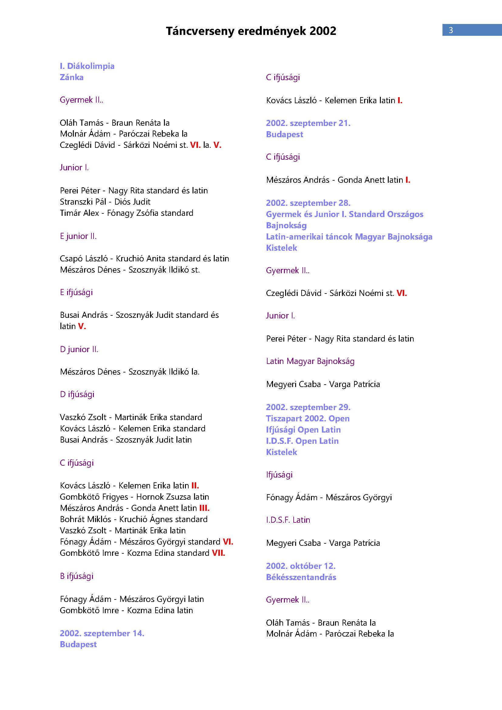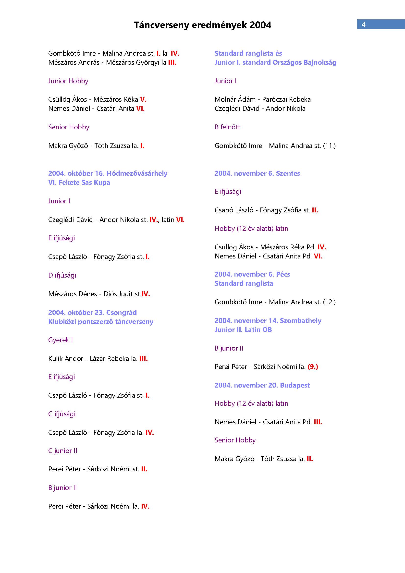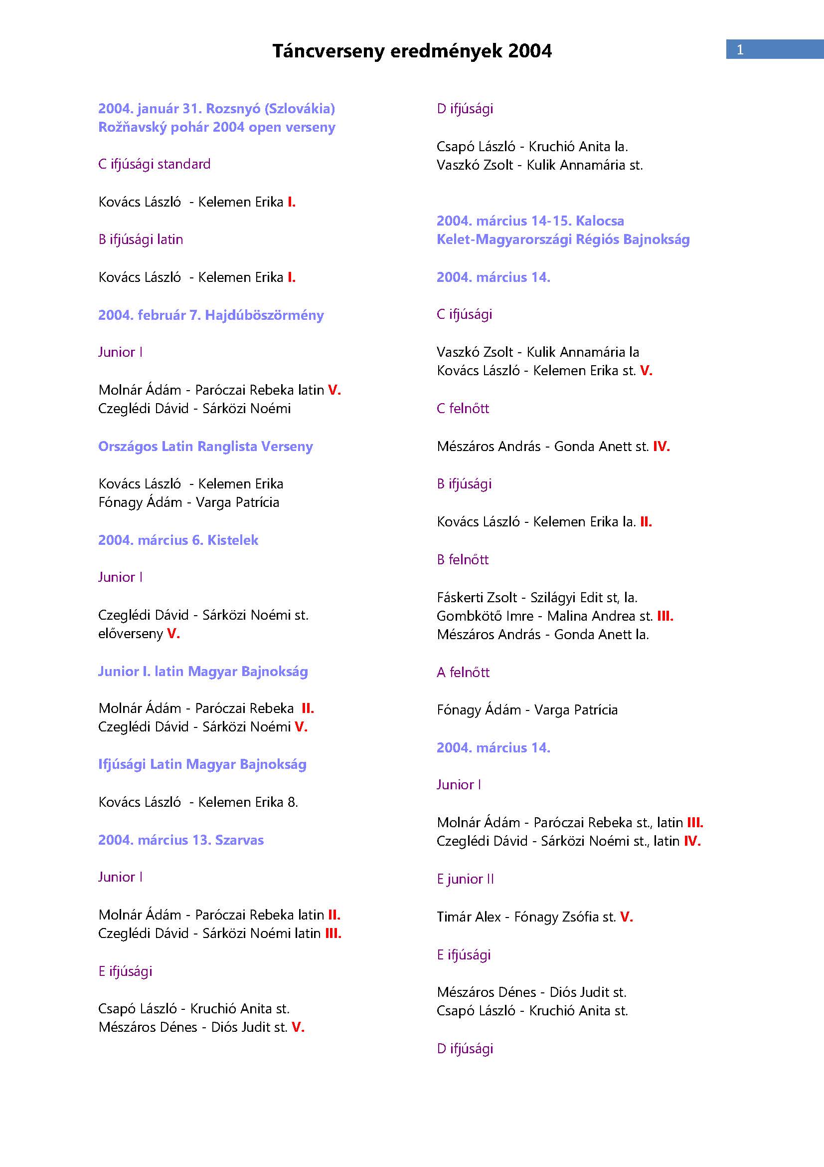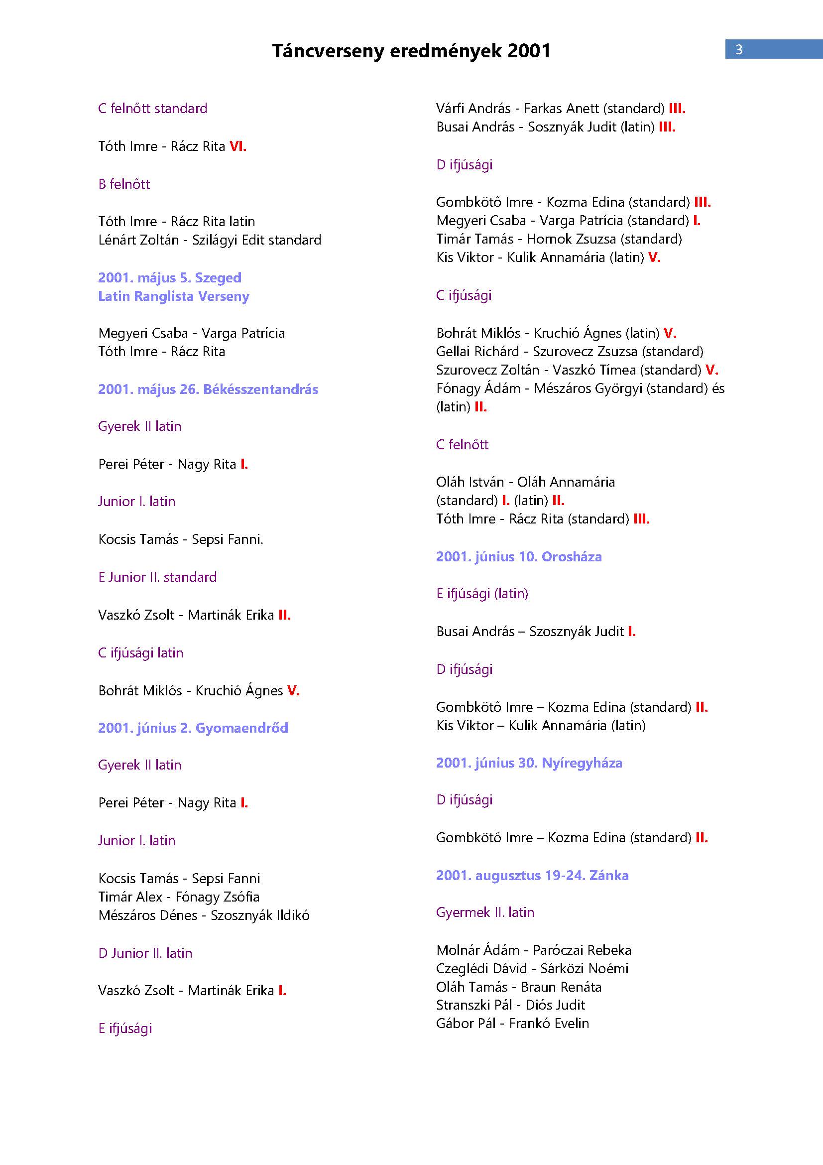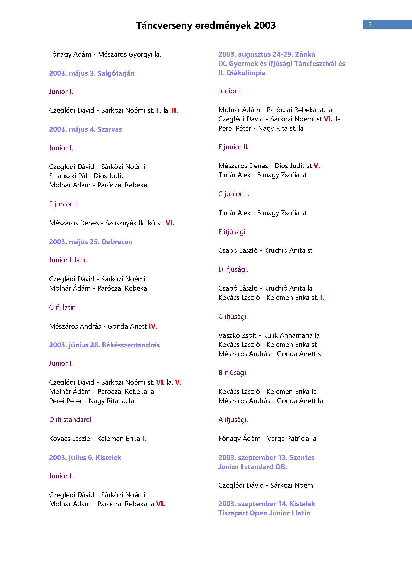 Versenyeredmények 1998-2016